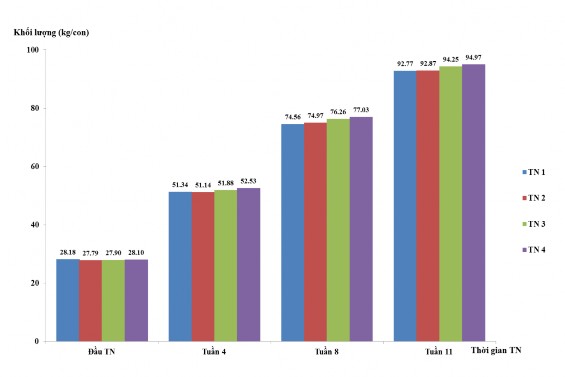 Đến 11 tuần thí nghiệm (kết thúc thí nghiệm) khối lượng lợn lô TN 4 đạt cao nhất, tiếp đến là lô TN 3, cao hơn các lô TN 2 và TN 1. Sự khác nhau về khối lượng cơ thể lợn của 4 lô thí nghiệm là có ý nghĩa thống kê (P<0,05).