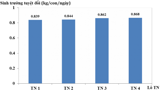 Tốc độ sinh trưởng tuyệt đối (kg/con/ngày) ở giai đoạn 1 - 4 tuần thí nghiệm cao nhất là lô TN 4 đạt 0,872 kg/con/ngày, sau đó đến lô TN 3, lô TN 2 và lô TN 1 có giá trị lần lượt là: 0,856 kg/con/ngày, 0,831 kg/con/ngày và 0,827 kg/con/ngày. Sự sai khác về độ sinh trưởng tuyệt đối giữa lô TN 4, lô TN 3 so với lô TN 2 và lô TN 1 là có ý nghĩa thống kê (P<0,05). Sinh trưởng tuyệt đối của lợn ở lô TN 1 và TN 2 là tương đương nhau.