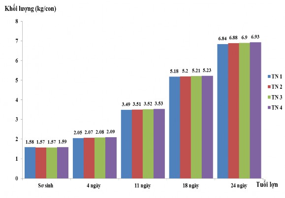 Khối lượng lợn con khi được 24 ngày tuổi đã cho thấy hiệu quả rò rệt khi sử dụng gạo tấm thay thế ngô vào khẩu phần ăn của lợn nái, khối lượng lợn con tăng tỷ lệ thuận với tỷ lệ của gạo tấm thay thế ngô trong khẩu phần ăn cho lợn. Khối lượng lợn ở tất cả các lô thí nghiệm đều khác nhau có ý nghĩa thống kê (P<0,05), cụ thể: cao nhất ở lô TN 4 đạt 6,93 kg/con, thấp nhất ở lô TN 1 (không sử dụng gạo tấm) chỉ đạt 6,84 kg/con. Như vậy, khối lượng lợn con đã tăng xấp xỉ 0,1 kg/con khi sử dụng gạo tấm ở mức thay thế ngô 75% trong vòng 24 ngày. Ở lô TN 2 và TN 3, khối lượng lợn con đạt cũng khá cao là 6,88 và 6,90 kg/con.