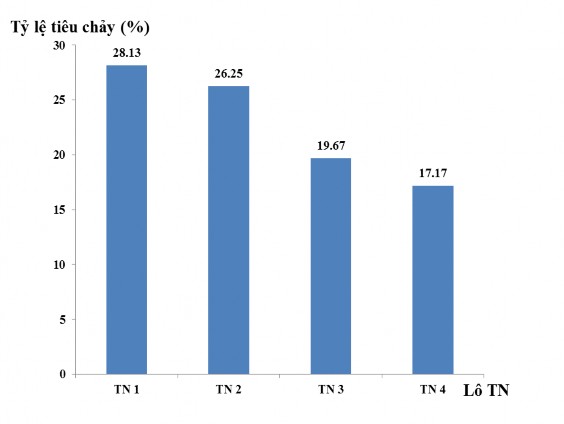 Tỷ lệ lợn con mắc tiêu chảy trong giai đoạn từ tập ăn đến cai sữa ở các lô thí nghiệm có sự khác nhau. Cụ thể: khi thay thế ngô bằng gạo tấm trong khẩu phần ăn ở mức 25% (lô TN 2) thì không có sự sai khác về tỷ lệ tiêu chảy so với không sử dụng gạo tấm trong khẩu phần (lô TN 1). Tuy nhiên, khi thay thế ở tỷ lệ 50% và 75% đã làm giảm tỷ lệ tiêu chảy rò rệt từ 28,13% xuống còn 19,67% (lô TN 3) và 17,17% (lô TN 4). Sự giảm tỷ lệ tiêu chảy này có ý nghĩa về mặt thống kê (P<0,05). Có thể thấy, tỷ lệ lợn con mắc tiêu chảy ở các lô khi sử dụng gạo tấm đã giảm đáng kể so với lô không sử dụng gạo tấm. Điều đó chứng tỏ rằng: khi thay thế ngô bằng gạo tấm đã có tác dụng làm giảm thấp tỷ lệ tiêu chảy trên lợn con trong giai đoạn theo mẹ.