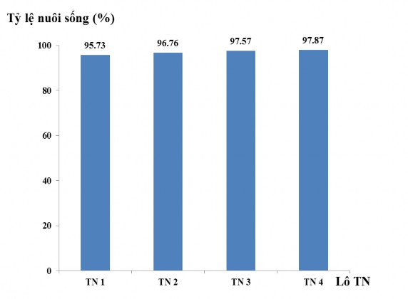 Tỷ lệ nuôi sống | 95,73c±0,46 | 96,76b±0,04 | 97,57ab ±0,01 | 97,87a±0,46 |