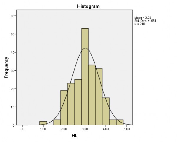 Từ bảng trên cho thấy: Giá trị trung bình (mean) = 3,0238, giá trị trung vị (mediane)= 3,0000, độ xiên (skewness)= - 0,167. Như vậy giá trị trung bình và trung vị gần bằng nhau, độ xiên thỏa mãn điều kiện (-1 < độ xiên <1), vì vậy có thể coi phần dư có phân phối chuẩn. Ngoài ra, biểu đồ Histogram cho thấy đường cong phân phối chuẩn có dạng hình chuông, có trị trung bình là 3,02 và số liệu phân phối khá đều 2 bên với độ lệch chuẩn của nó gần bằng 1 (Std. Dev = 0.661). Do đó ta có thể kết luận rằng giả thuyết phân phối chuẩn không bị vi phạm.
