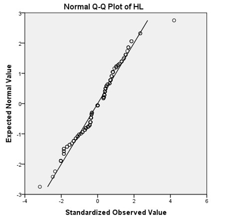 Sử dụng chức năng vẽ biểu đồ xác suất chuẩn (normal Q-Q plot) theo Hình dưới đây. Qua biểu đồ Normal Q-Q Plot cho thấy các trị số quan sát và trị số mong đợi đều nằm gần trên đường chéo thể hiện mối quan hệ tuyến tính. Như vậy có thể kết luận phần dư có phân phối chuẩn, không bị vi phạm.