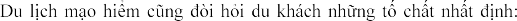 nh mạng cho du khách. Do vậy loại hình này cần nhiều vốn về cơ sở vật chất cũng như đào tạo về nguồn lực trong công tác hướng dẫn. Tùy theo mức độ của trò chơi mà việc trang bị các thiết bị là khác nhau. Đội ngũ nhân viên trong các tour phải là những người có trình độ chuyên môn nghiệp vụ cao, không những giỏi về nghiệp vụ mà còn phải có kiến thức về những vùng đoàn sẽ đi qua. Thông thường các hướng dẫn viên trong tour mạo hiểm sẽ là các huấn luyện viên. Có thể thấy, du lịch mạo hiểm là một loại hình sử dụng nhiều không chỉ về tài chính mà còn về nguồn nhân lực.